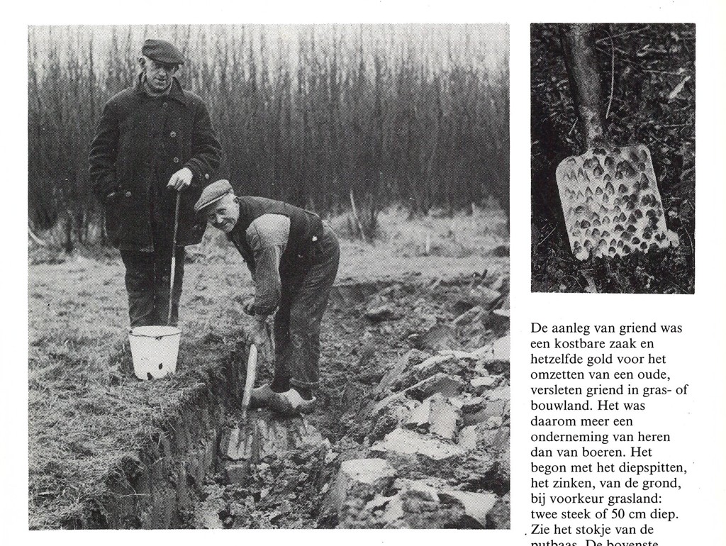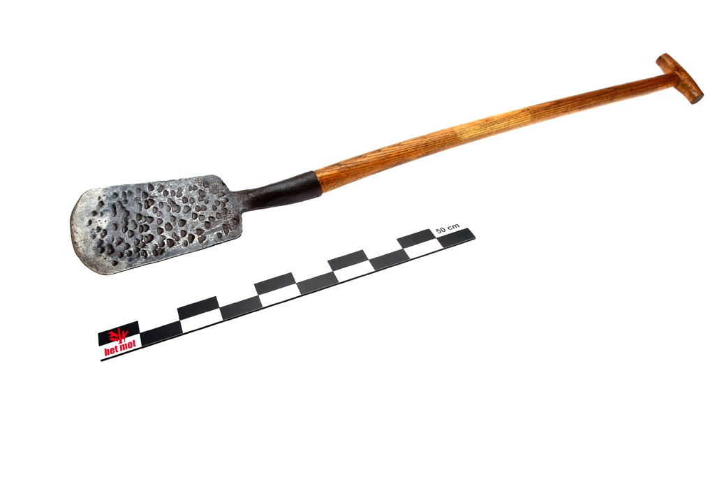 Spade with long (approx. 30-40 cm) and narrow (approx. 10-17 cm) blade that is slightly curved in relation to a T or D handle (70-95 cm). To make it easier to penetrate into the ground, the edge of the blade is often slightly curved and usually narrows a few centimeters downwards (1). The top is sometimes provided with a footrest to prevent damage to the user's shoe. To prevent the clay soil from sticking to the blade, the latter is dipped into a bucket of water before each stitch; sometimes dents are punched in the concave side of the blade with a hammer (2).