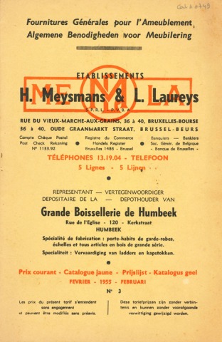 Grande Boissellerie de Humbeek. Etablissements H. Meysmans & L. Laureys pvba. Fournitures générales pour l'ameublement. Prix courant - catalogue jaune - fevrier 1955 = Algemene benodigheden voor meubilering. Prijslijst - katalogus geel - februari 1955. N° 3