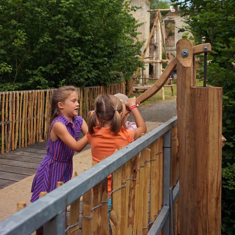 Op de brug naar het Prinsenkasteel staat een houten waterpomp, resultaat van een geslaagd experiment met het doorboren van een stam.