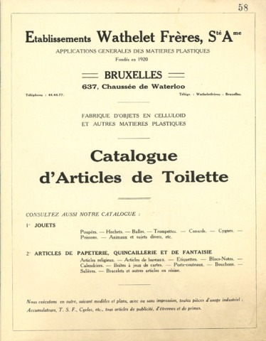 Etablissements Wathelet Frères S.A. Applications générales des matières plastiques. Catalogue d'articles de toilette
