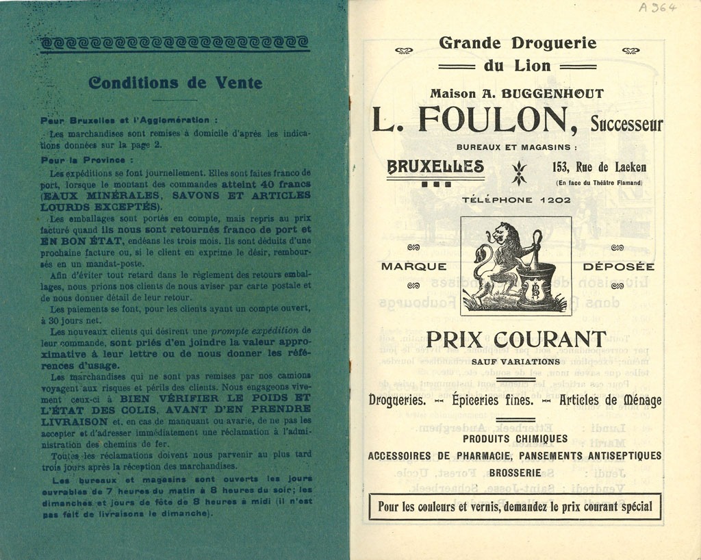 Maison A. Buggenhout L. Foulon Successeur. Grande Droguerie du Lion. Prix courant