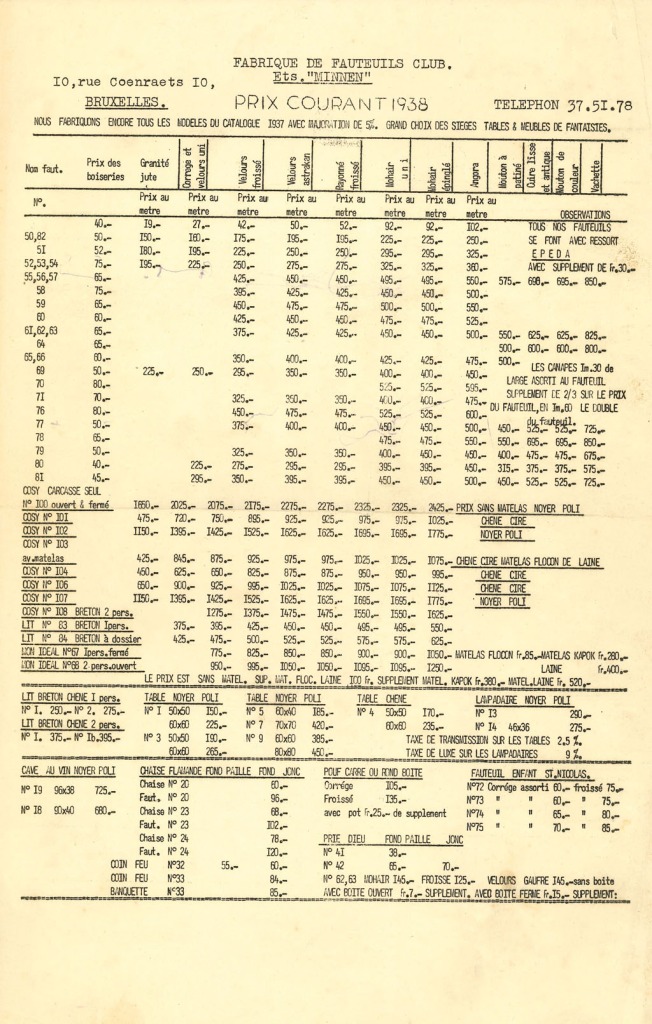 F.M. Fabrique de Fauteuils Club. Ets. Minnen. Prix courant 1938