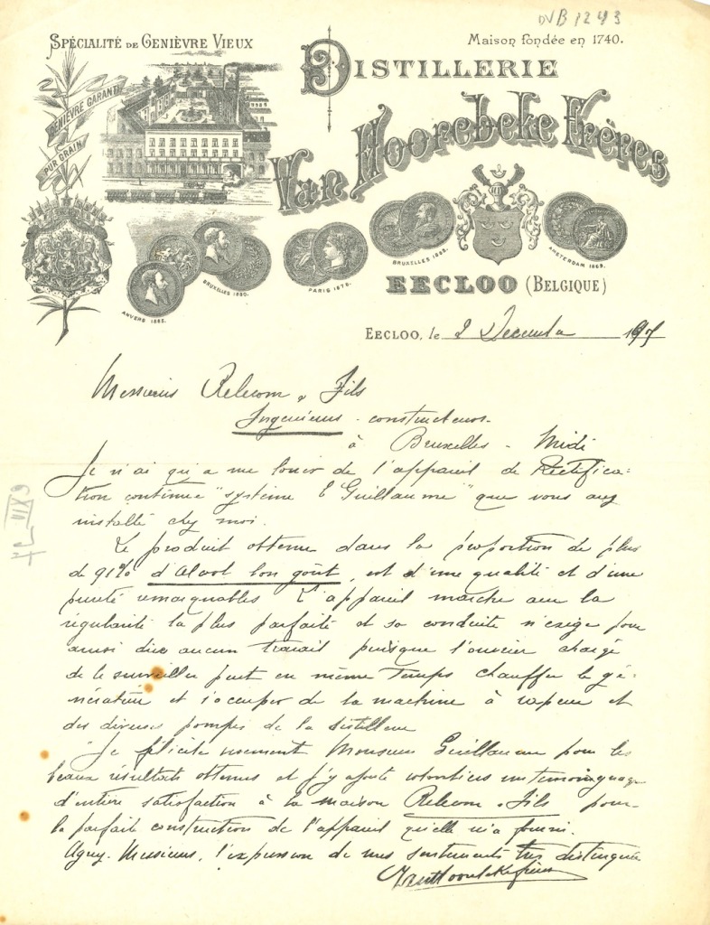 Distillerie Van Hoorebeke Frères. Spécialité de genièvre vieux. Messieurs Relecom & fils ...