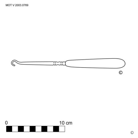 The button hook is a small (approx. 10 cm) iron hook - often with a (decorated) iron, wooden, bone or ivory handle - with which the ladies' boots used to be tied (1). There is also a model with two hooks of different sizes. Another model is foldable.