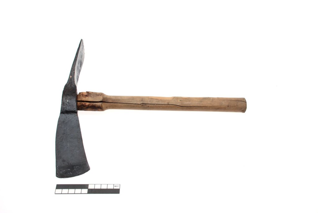 Het blad met de snede haaks op de steel is licht naar beneden gericht of gebogen, waarmee het zich onderscheidt van de bikhamer. [MOT]