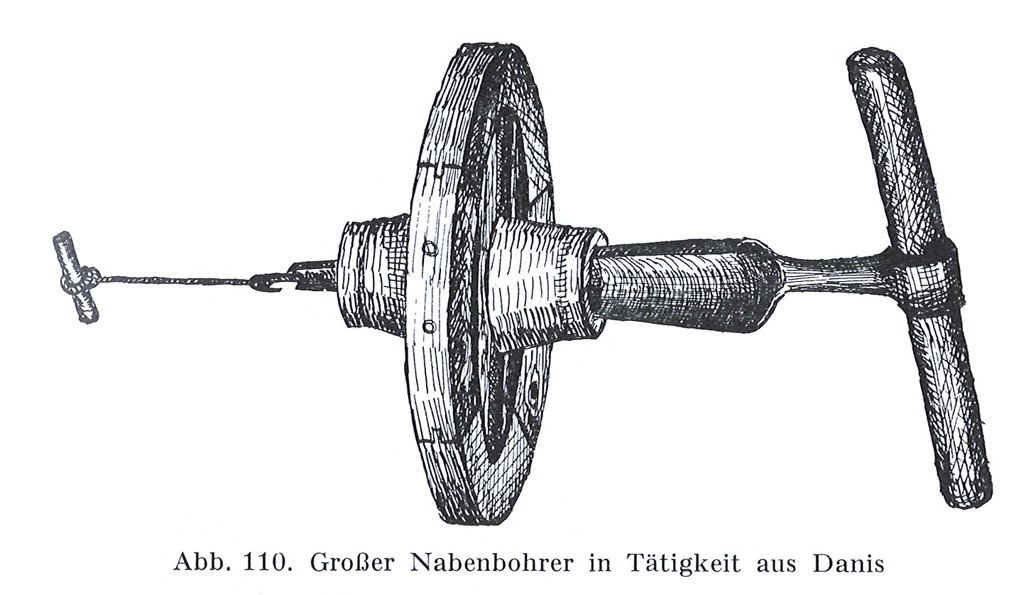 (1) Sommige wagenmakers gebruiken de naafboor niet. Ze hollen het naafgat met een guts uit (STURT: 130; JENKINS: 112; ook opgetekend bij J. BERCKMANS, Halle, Vlaams-Br.).