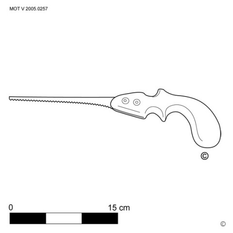 La scie à guichet est utilisée pour couper des lignes courbes et surtout pour percer un trou au milieu d'une planche. Elle ressemble à la scie à main, mais est plus courte (environ 20-30 cm) et a une lame beaucoup plus étroite (environ 1,5-2 cm) qui se rétrécit et est fixée dans une poignée pistolet ouverte ou une poignée droite. Il existe maintenant de petites scies à guichet à manche métallique droit dans lequel la lame coulisse, de sorte que l'artisan puisse faire dépasser celle-ci autant que nécessaire.